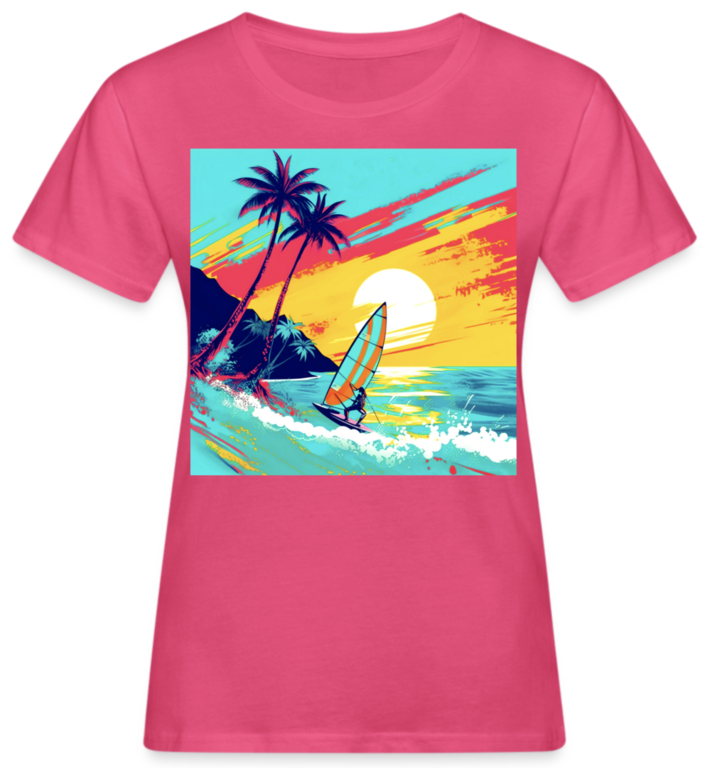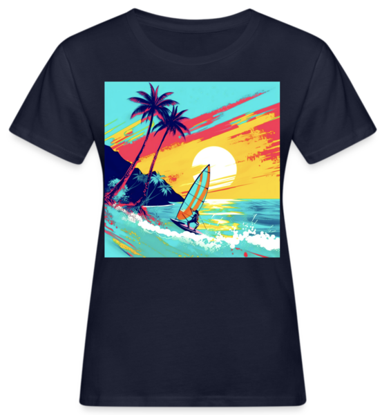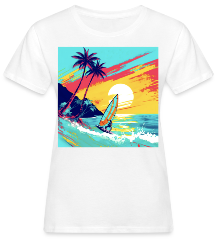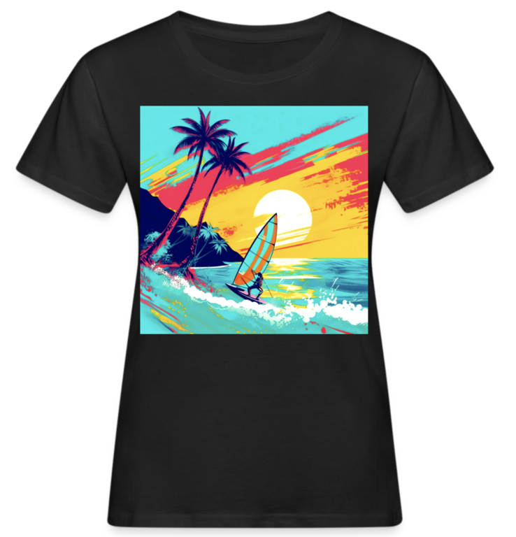 Das T-Shirt ist mit einem atemberaubenden Bild bedruckt, das eine furchtlose Frau beim Windsurfen zeigt. Die Szenerie umfasst
